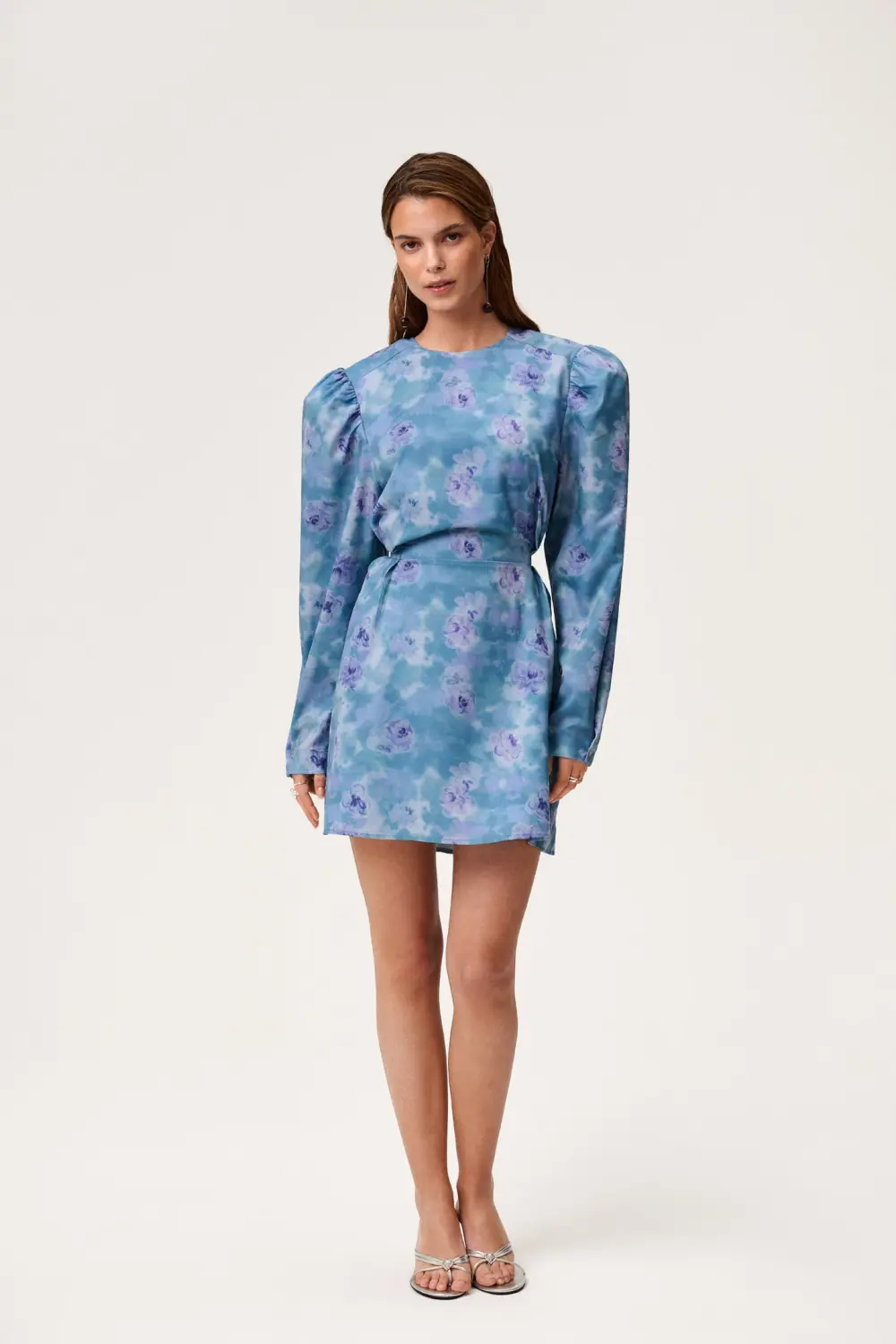 Cannes minikjole i blått blomstertrykk. Kjolen har dristige skulderputer, knytebånd i midjen for en flatterende silhuett, og skjult glidelås bak. Ermene har en knapp ved mansjetten, slik at du kan justere mellom en slank eller rett silhuett. Kjolen er helfôret og har en rund halsutringning.