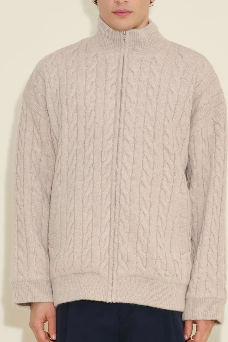 Mitosis Zip Jacket er laget av en myk og koselig kabelstrikk som gir en klassisk og tidløs estetikk. Kabelstrikken tilfører tekstur og visuell interesse til plagget, samtidig som den gir ekstra varme på kjølige dager. Den høye halsen gir ekstra beskyttelse mot vind og kulde, noe som gjør denne cardiganen til et praktisk valg for høst- og vintergarderoben.