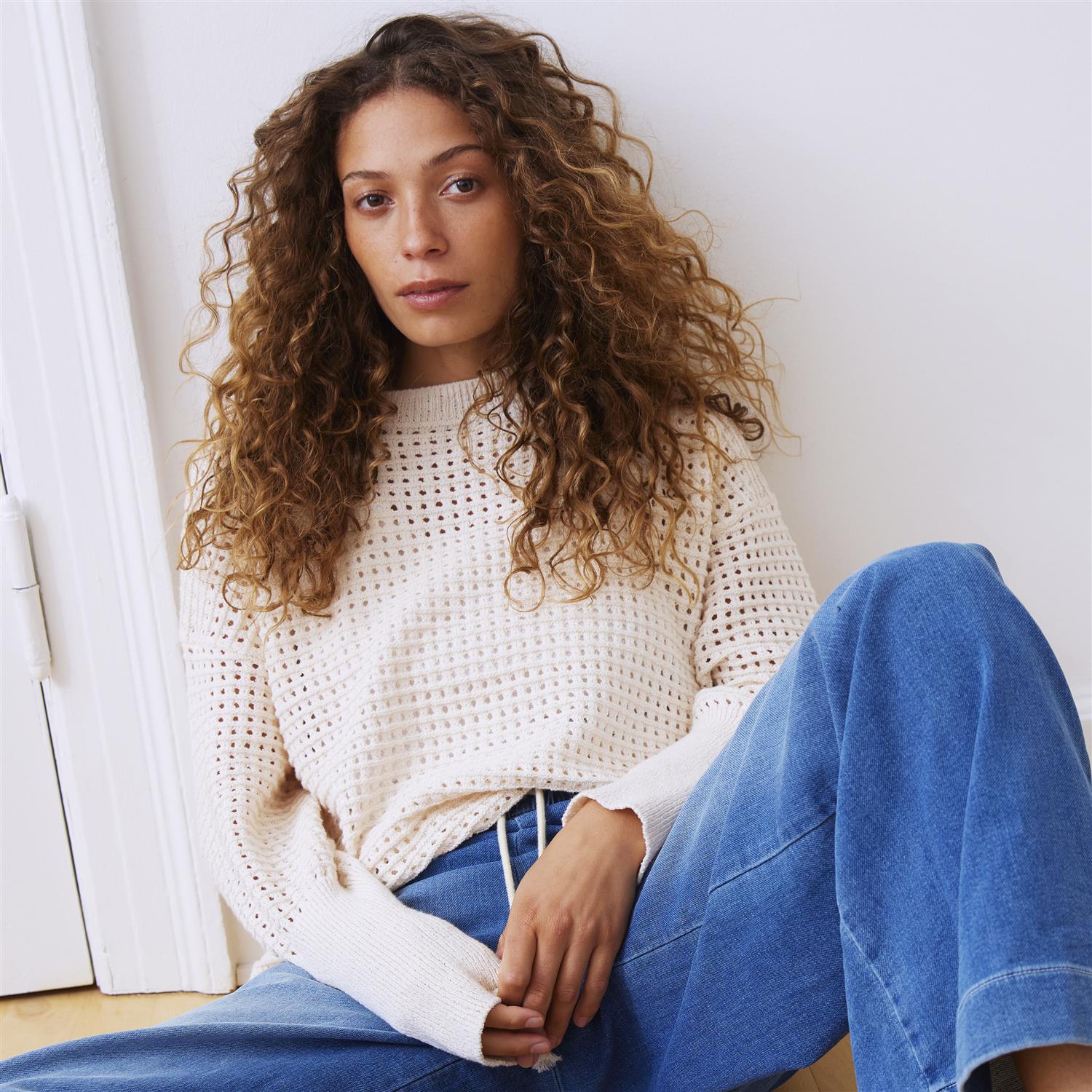 Skikkelig kul strikk med hullmønster i oversized passform og hele 70% bomull.