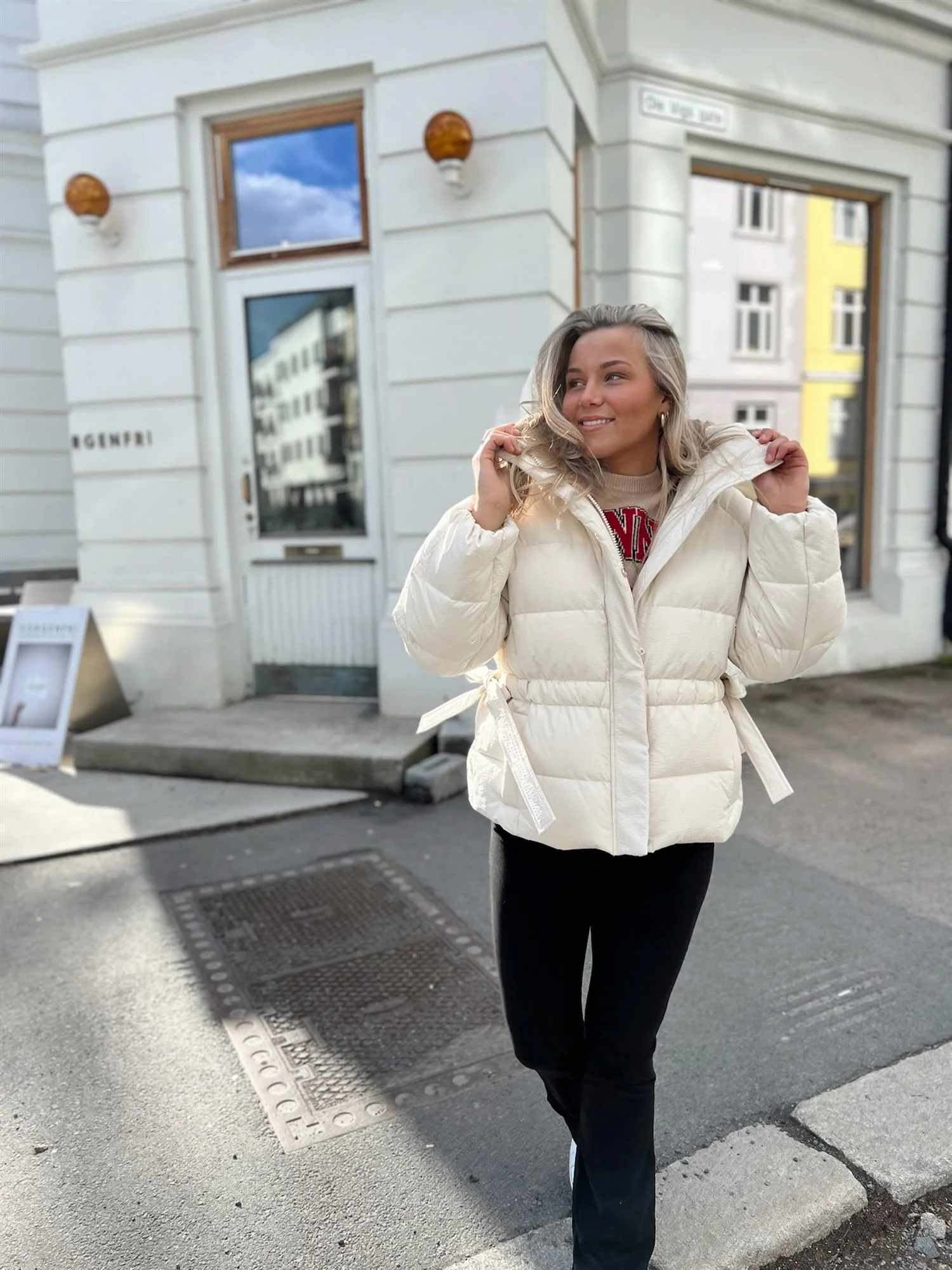 - Detaljer: Høy krage, hette, glidelåslukking foran med skjult stolpe, sidelommer, justerbare knytebånd i midjen
