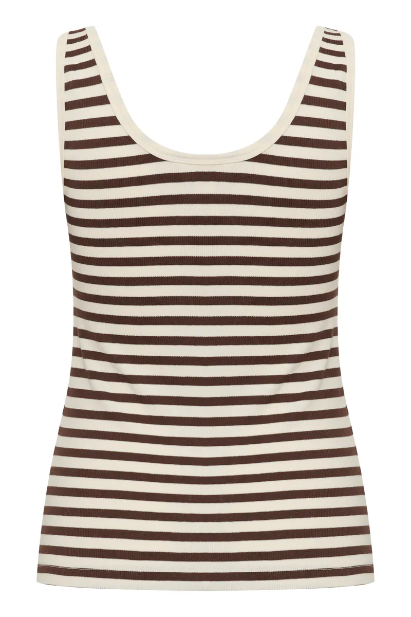 Part Two Roselyn Top Bracken Stripe. Ribbestrikket singlet i myk bomullskvalitet med klassiske striper og smal passform. Den dype, avrundede utringningen gir et feminint preg, mens det myke materialet sikrer komfort hele dagen. Perfekt for lag-på-lag-styling eller alene på varme dager.
